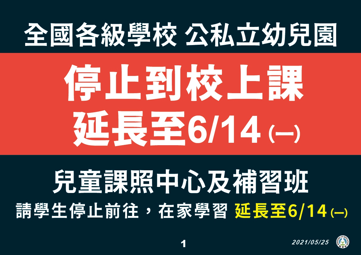四、 因應全國實施疫情警戒第三級時間延長,為降低群聚感染之風險,維護學校師生健康及學習權益,全國各級學校及公私立幼兒園停止到校上課延長至110年6月14日(一)止;兒童課後照顧服務中心、補習班等各類教育機構亦請所有學生停止前往,留在家中學習。相關支援與配套如下: