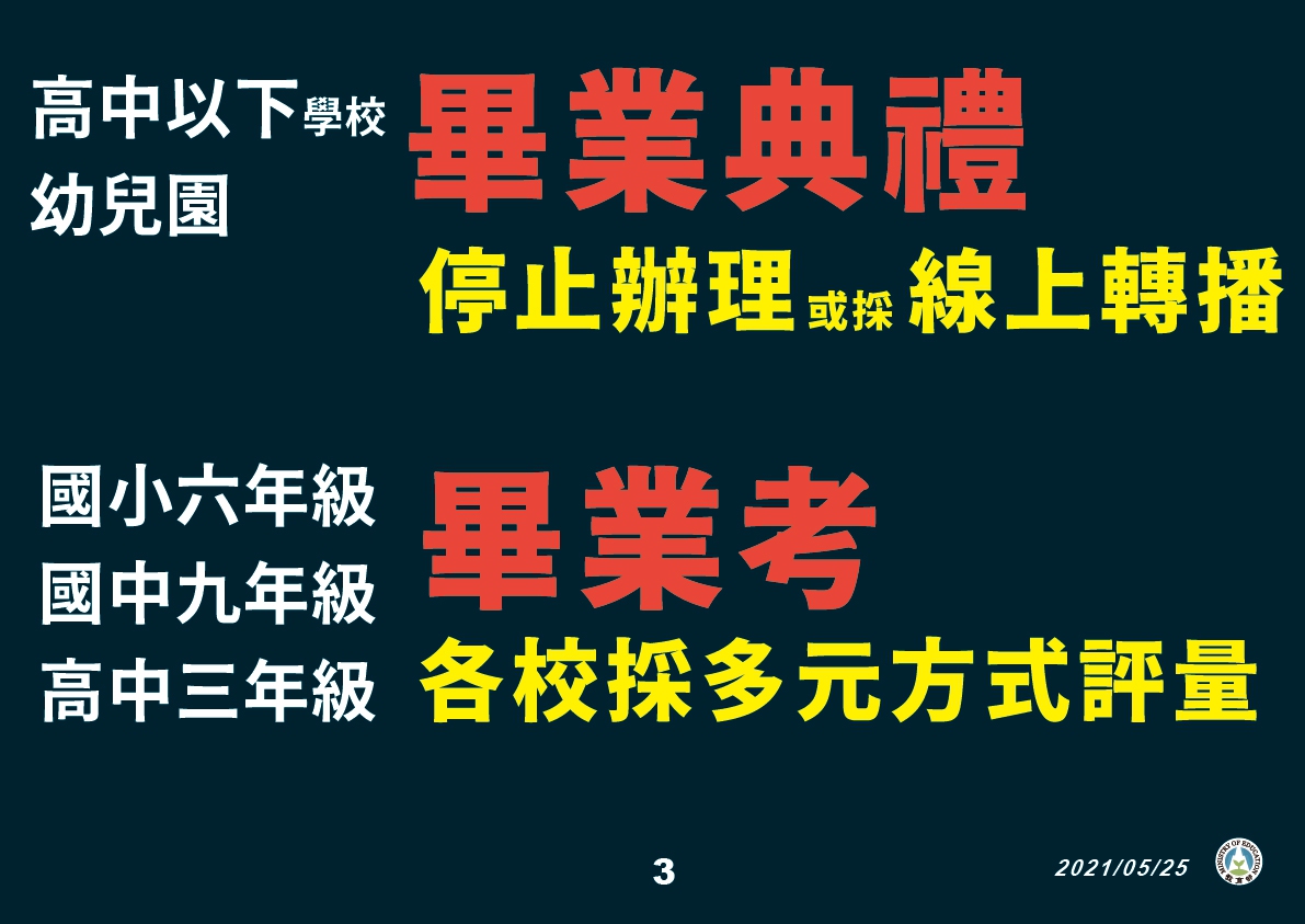 (二) 畢業典禮停止辦理:為持續落實防疫工作,請各級學校及公私立幼兒園畢業典禮配合停辦,如需辦理,採線上轉播方式辦理,避免不必要之移動、活動或集會。