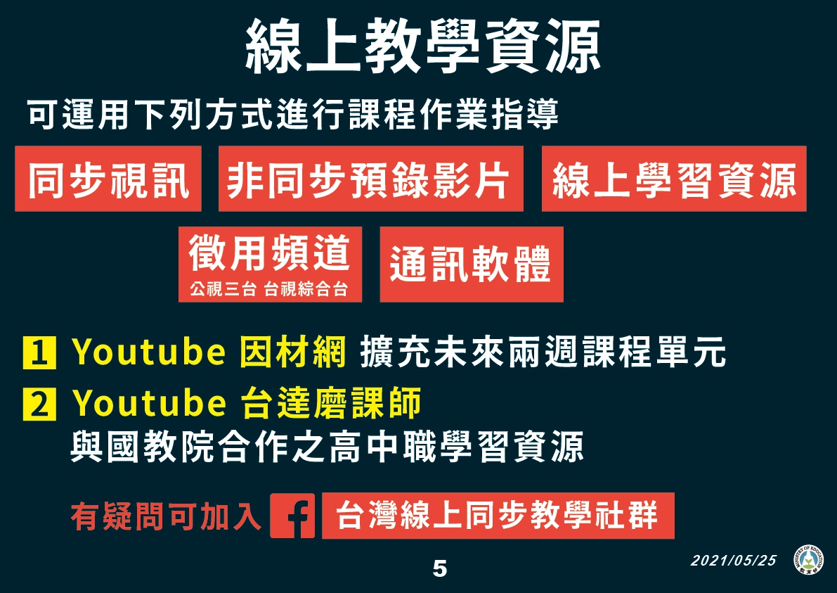 3. 教師如在線上遠距教學遭遇視訊軟體、線上教學技巧、線上教學資源等問題,除可參考「教育部線上教學便利包」外,亦可加入臉書「台灣線上同步教學社群」,依照「主題」查詢輔助資源或尋找諮詢協助。