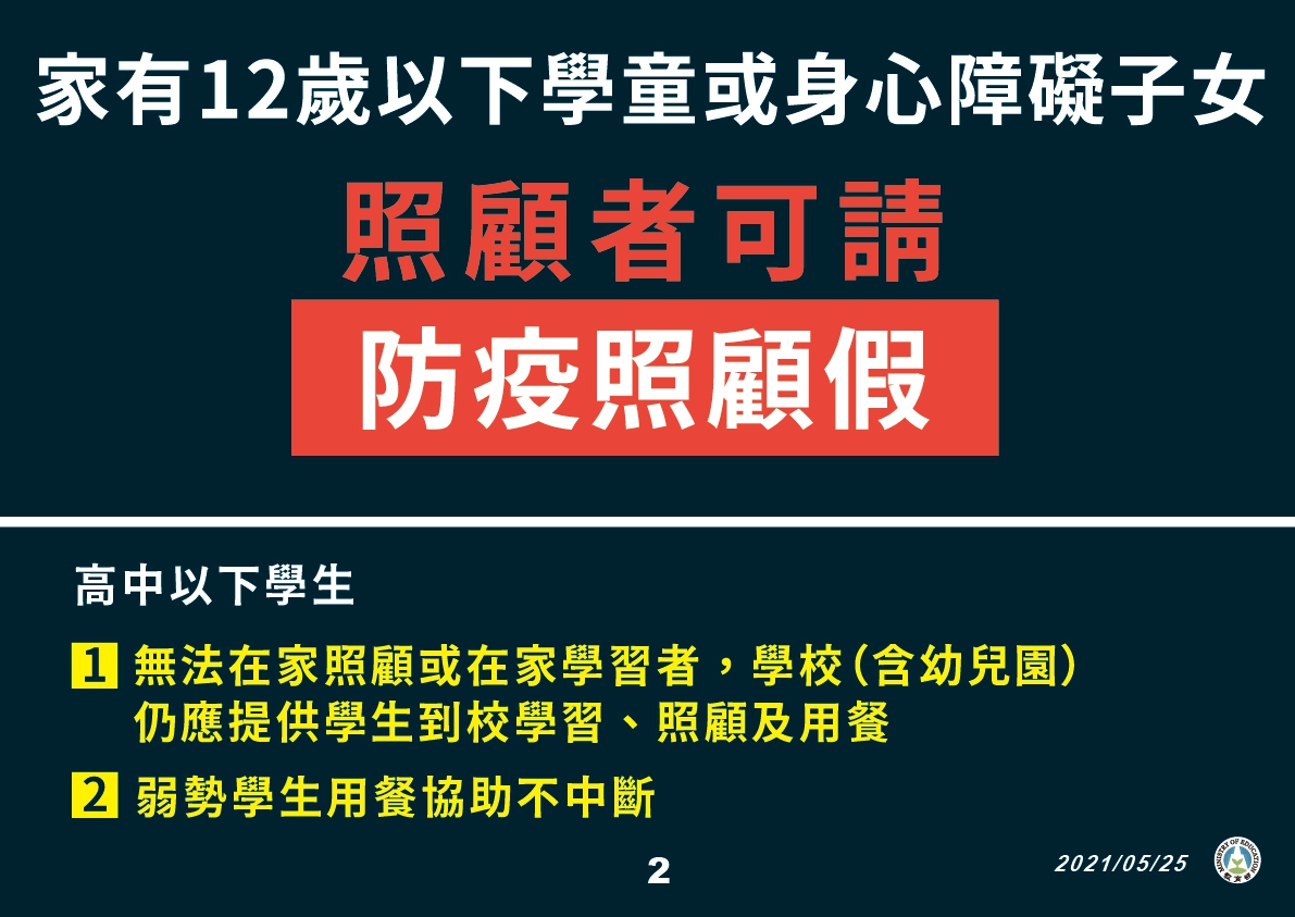 (三) 家長服務:延長停止到校期間,若家中有12歲以下學童及身心障礙子女需照顧者,家長可請「防疫照顧假」;高中以下學生(含幼兒園)之家長因故無法在家照顧或學生無法進行居家學習者,學校(含幼兒園)仍會安排人力,提供學生到校學習、照顧及用餐;居家線上學習期間,也將持續強化弱勢學生關懷機制,讓用餐協助不中斷。