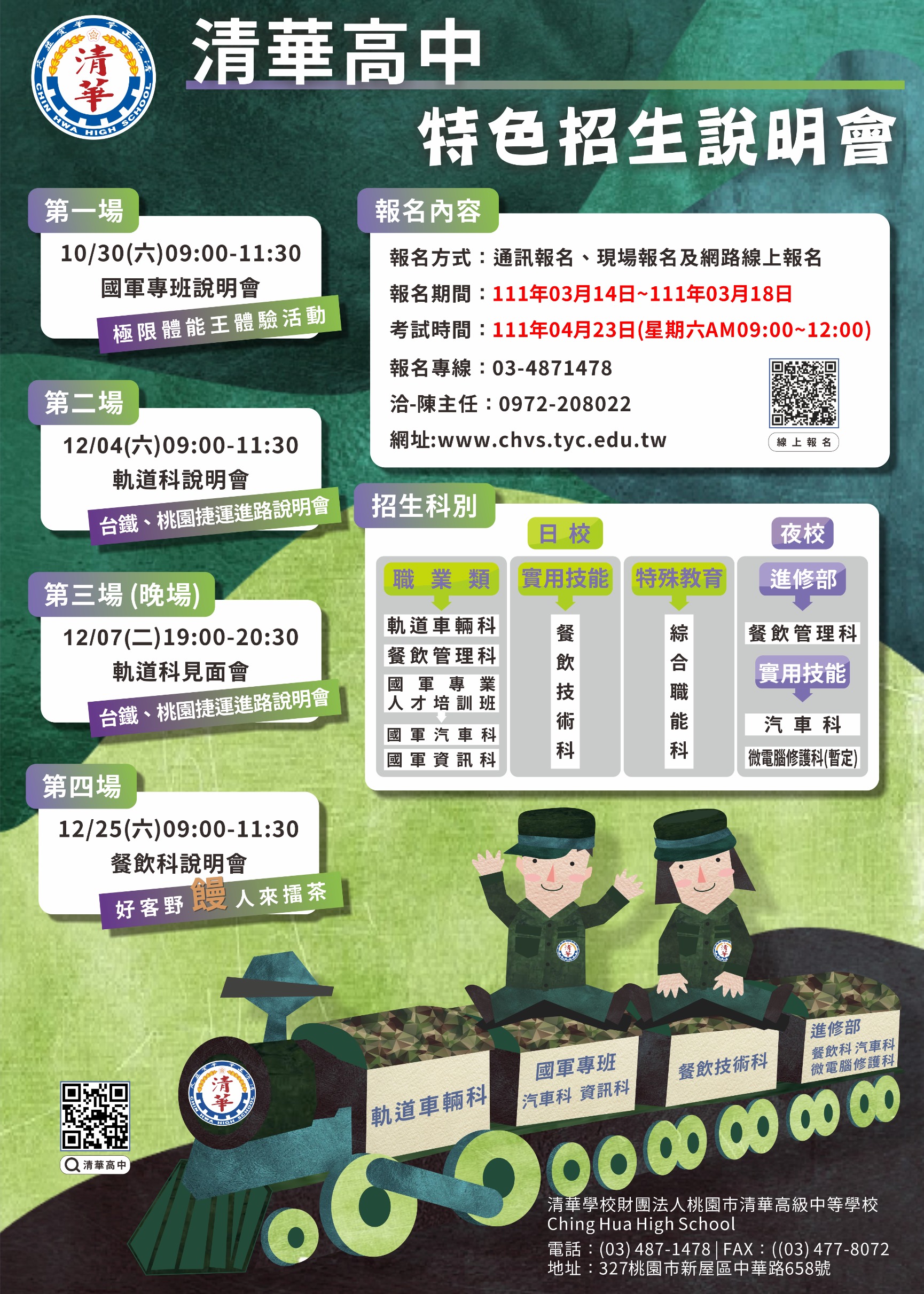 三場:12/07(二)19:00-20:30軌道車輛科說明會暨台鐵、桃捷進路說明會。(四)第四場:12/25(六)09:00-11:30餐飲科說明會暨好客野饅來擂茶活動。