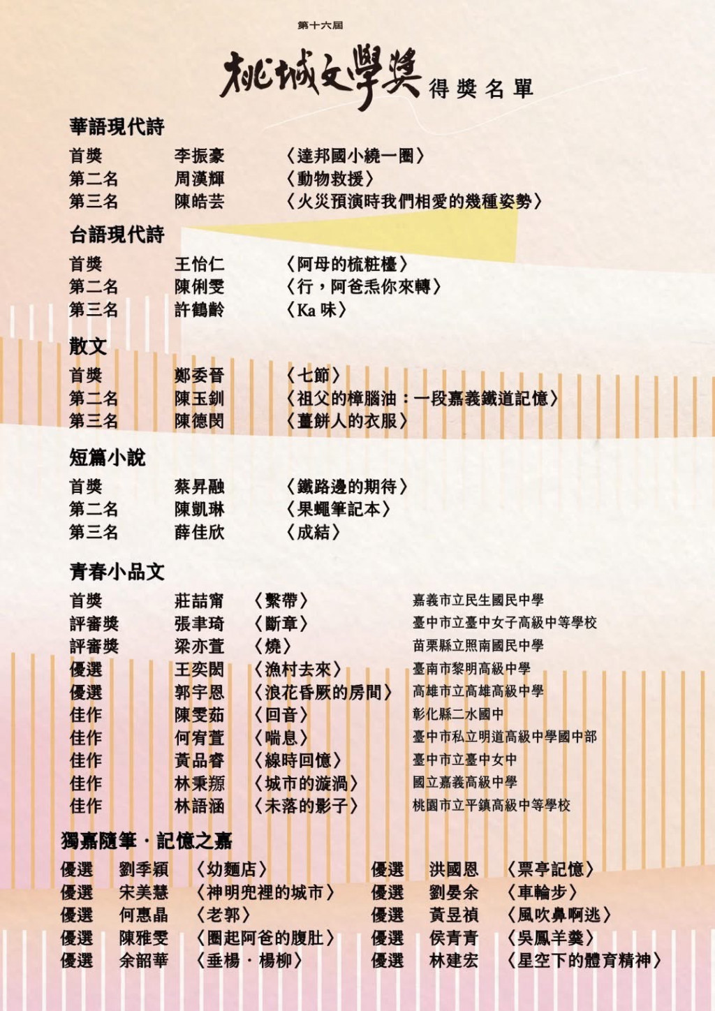 恭賀本校陳雯茹同學參加 第十六屆桃城文學獎 青春小品文組 競賽 ,以「回音」一文榮獲 佳作,